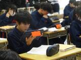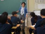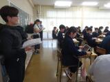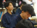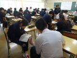 北中では先生方が年齢や教科が異なるグループに分かれて授業を公開し合い、生徒の学びを深めるための方策などを検討する研修を行っています。今日の3限は3年生でS先生の授業(国語)で実施しました。古典の学習に苦手意識をもつ生徒が多いですが、それを軽減し、和歌などに親しんでほしいという先生の願いがあふれています。平安時代の『古今和歌集』の「仮名序」を題材に、奈良時代以降和歌が受け継がれ短歌として親しまれていることについて考えました。そのために、実際に文字を追いかけ声に出してみます。先生が「古典はリズム!」と働きかけると、生徒は一斉に大きな声で文章を読みます。教科書に載っている二次元コードをタブレット端末で読み込み、模範となる音読を聞く場面もありました。様々な手をかけて、当時の人々の思いに触れる時間となりました。