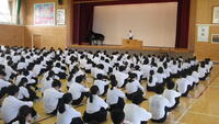 夏休み前最後の全校朝会。1校歌斉唱 2校長の話 3各種大会報告 4表彰 5北信越大会出場者決意表明