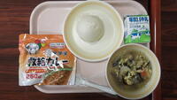 5年度の春。自然災害が起きたとき、また、給食提供が困難であるときなどに備え、非常食用として「救命カレー」を購入、その救命カレーが本日提供されました。災害時用レトルトカレー(ご飯とルーが混ざっていて、スプーンで食べました)、トックスープ、中華まん、牛乳という献立でした。