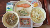 特別メニューでした。ちら焼き 海苔焼き海苔(表紙:こんこん) 鮭のうす塩焼き 合格沢煮椀 がんばレンコンサラダ 牛乳 いいよかんゼリー 穴のあいた「れんこん」は、先が見通せる縁起のよい食べ物です。