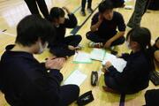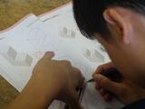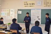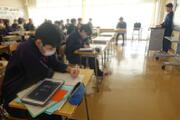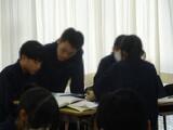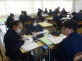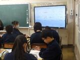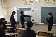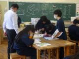 1組(数学)は、比例・反比例のまとめをグループで行っていました。各グループに割り当てられた課題に真剣に取り組んでいました。各グループの解答はモニターに映し出され、全員が確認したところで先生から「OK」をもらっていました。2組(技術・家庭)は、等角図の製図の演習をしていました。描き方を動画で確認したり、先生に見てもらったりしながら定規を当てがって丁寧に作業を進めていました。3組(英語)は体調不良を訴えたり、その人に声を掛けたりする場面での会話練習をしていました。練習相手とすぐに向き合って、声に出す様子は頼もしかったです。その後表現の確認を、クイズ形式で取り組みました。単語そのものや、語の並べ替えで英文をつくる問題をとおして、楽しみながら覚えようとしていました。