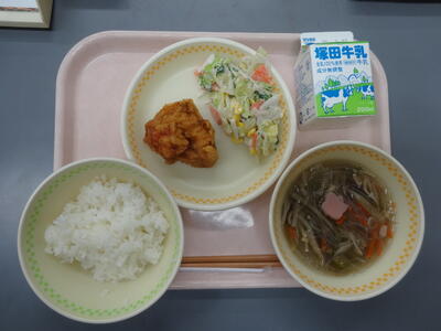 今日の給食は、五泉市の中学校統一献立「3年生応援! がんばれんこん献立」でした。縁起物満載のスペシャルメニュー(ごはん、合格沢煮椀、とり天、がんばれんこんサラダ、牛乳)です。とり天は「取り点」で1点でも多く取れますようにとの願いを込めて。人気の沢煮椀はオクラの五角形(ごかく)から「合格」を。学問の神様とされる菅原道真(すがわらのみちざね)がこよなく愛した梅の形のかまぼこも入っていました。先が見通せて縁起の良い食べ物と言われる五泉名物のれんこんが入ったサラダで、「がんばれんこん!」という給食室からのエールです。