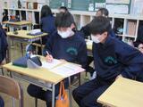 4限の学活で、各教科係が話し合って1年間お世話になった教科担任の先生に宛ててメッセージカードを作成していました。入学から早くも1年が経とうとしていて、もうすぐ先輩になるみなさん。1年間の学習を踏まえ、次の年に向けてがんばってもらいたいですが、こうして節目にきちんと感謝の気持ちを伝えることは大切ですね。